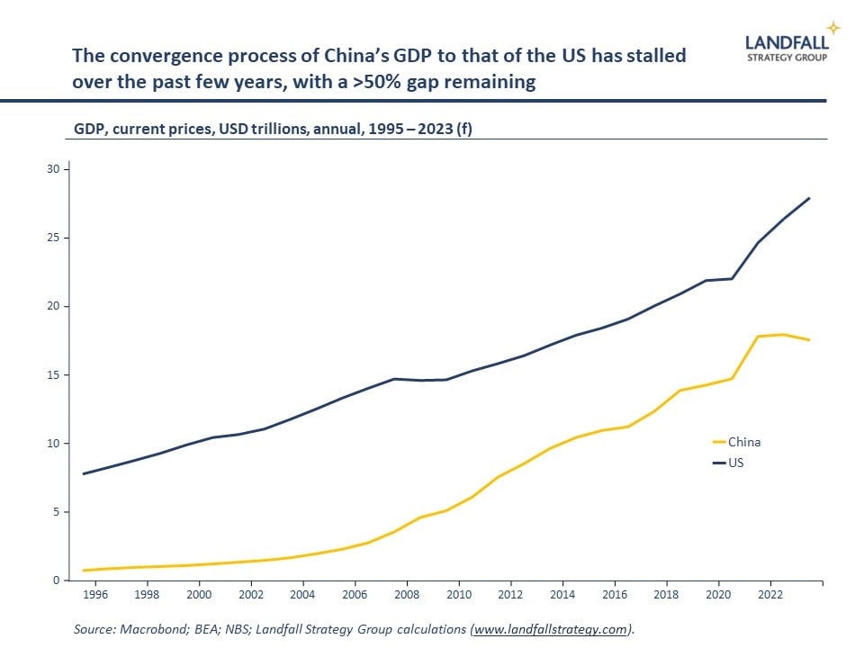 USA v China: China’s GDP convergence process towards the US has slowed, with the US around 50% larger in nominal terms; contributing more GDP growth and import demand.